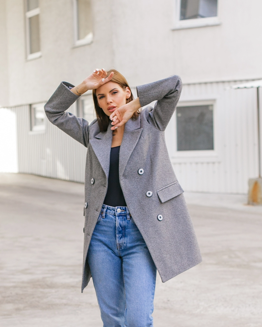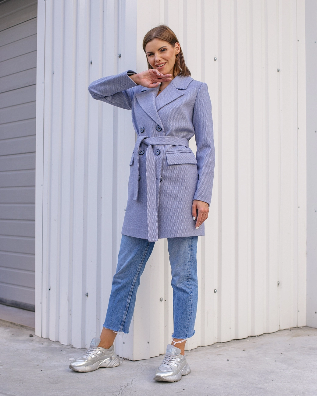 Двубортный полуприталенный жакет-пальто с поясом. Размерный ряд с 40 по 50